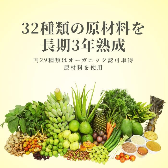 オーガニック栽培された薬草、果物、お野菜など32種を主原料に3年間じっくりと長期発酵熟成させて製造いたしました。